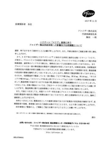 平成29年11月30日、セララ錠50mg以外の出荷調整は解除されました。 ハリケーン「マリア」被害に伴う ファイザー製品供給体制への影響及び一部対象製品の出荷調整解除について 平成29年11月2日、ファイザーはセララ、ジスロマックSR成人用ドライシロップ、ザ…