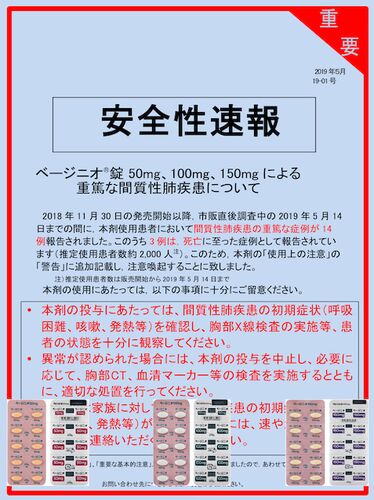 2019年5月17日、厚生労働省はベージニオ錠(一般名:アベマシクリブ)を発売する日本イーライリリーに対して「安全性速報(ブルーレター)」により注意喚起を行うよう指示しました。 ベージニオ錠の投与後に重篤な間質性肺疾患を発現、死亡に至った症例が報…