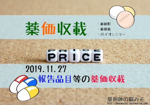2019年11月26日に薬価収載された医薬品についてまとめた記事です。 主に報告品目として承認された医薬品が薬価収載されており、新規格、新剤形、バイオシミラーなどが薬価収載されています。 各薬剤の特徴や薬価、発売日についてまとめています。